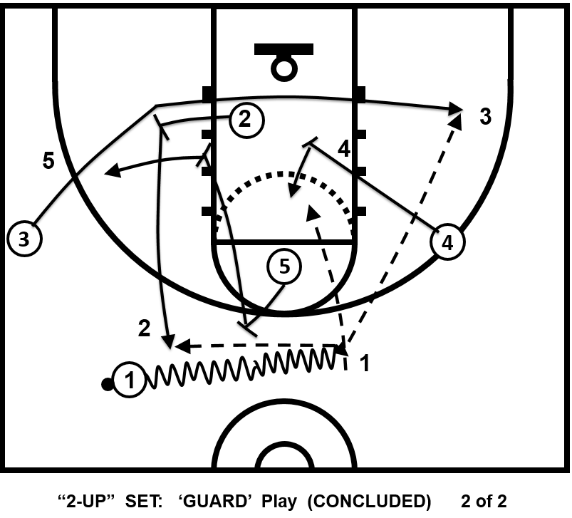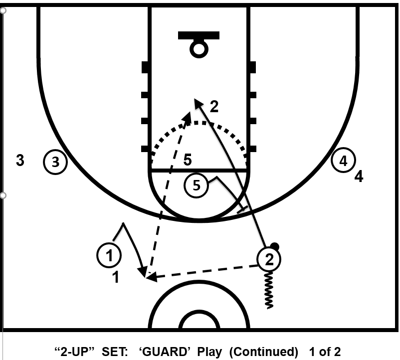This play can be executed to either side of court, but must be called for all offensive players to know. This offensive set is invaluable because it is sym-metrical, allowing all offen-sive plays or entries to be able to be executed to either side. This makes the offense even less predictable & therefore harder to defend. When the ‘live’ reverse pass is made, that Guard (02) cuts hard to rim off of 05’s back-screen. This action inverts a so-called peri-meter player (02 or 03) & converts him basically to become an inside player. This forces a perimeter defender into trying to be an interior defender.